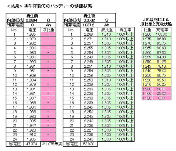 ※再生前は液比重が全セル1.075未満で硫酸鉛バッテリー用の比重計では測定することが出来ませんでした。