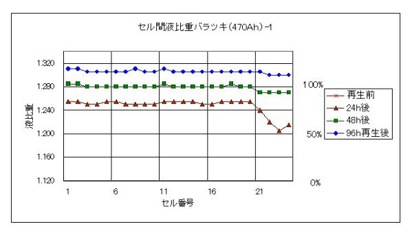 ※再生前の液比重は充電量0%である1.120より低く、グラフ下限以下の状態からの再生となりました。